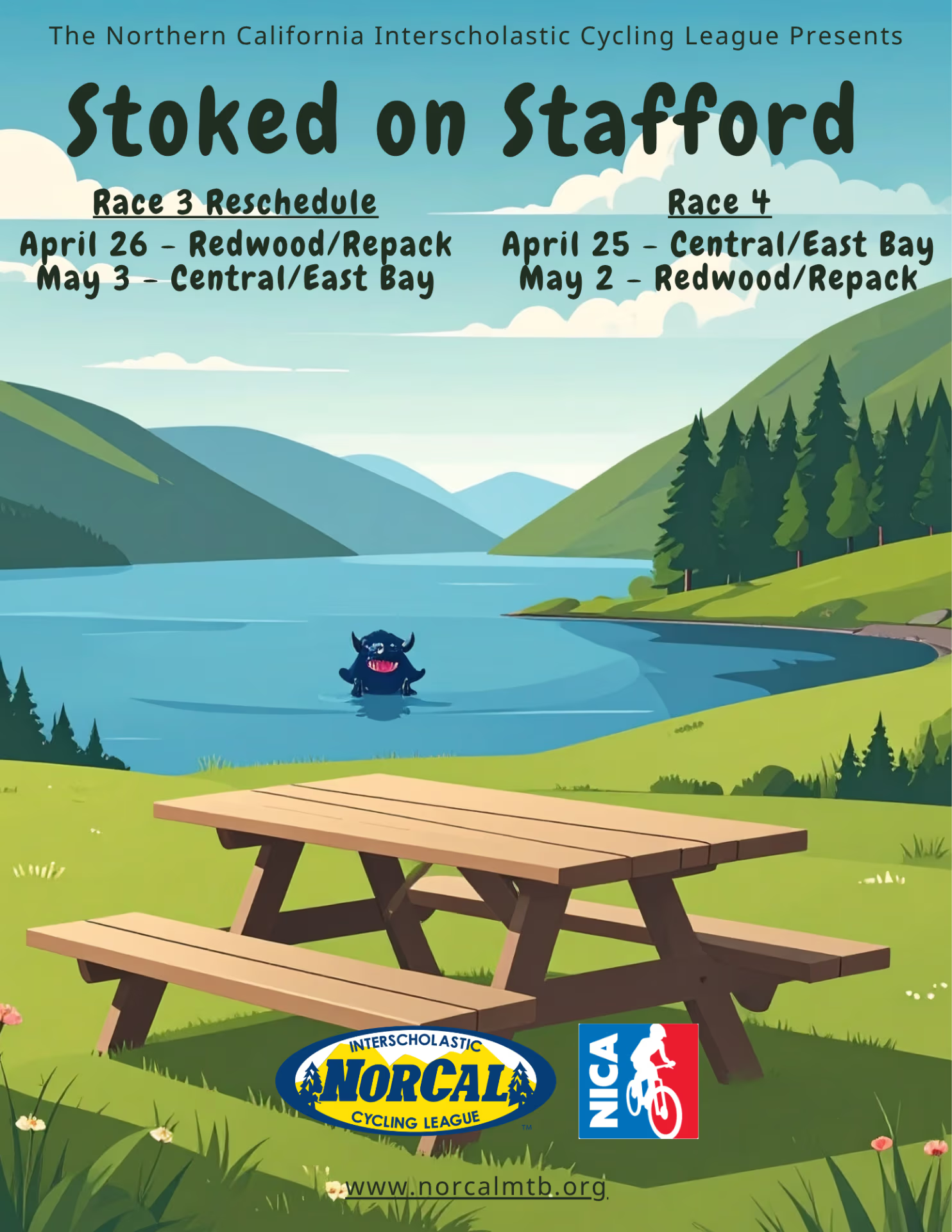On Friday, will aim to start heading out with riders in pre-ride waves starting at 3:30 until 6:30. Meet at the Stafford Bike Park Pavillion. We will take riders in small groups at they arrive. You are required to have a Redwood MTB coach with you to pre-ride the course.